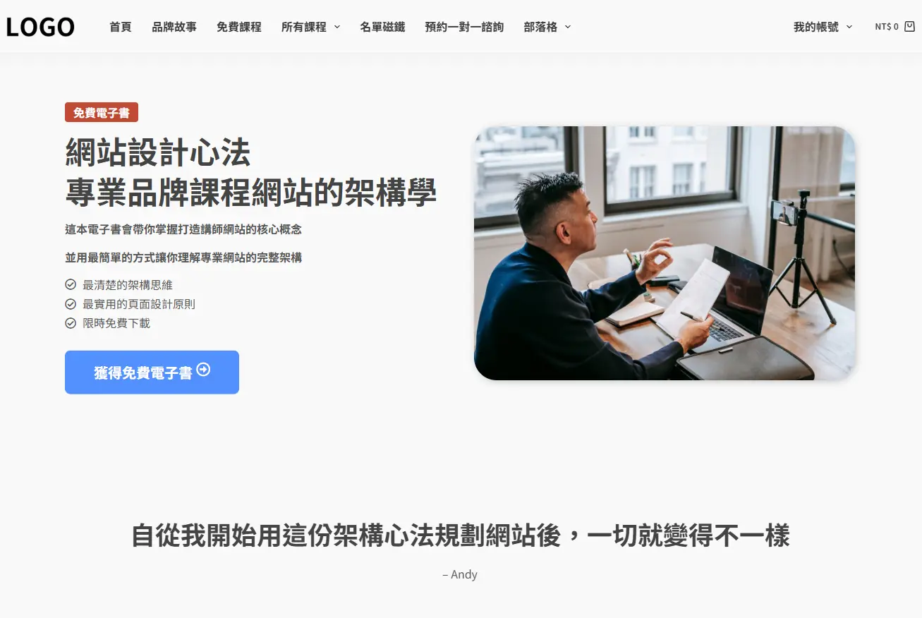 網站模板經過行銷邏輯的專業設計,包含登陸頁、品牌故事、付費課程、免費課程、名單磁鐵、預約諮詢、部落格頁面