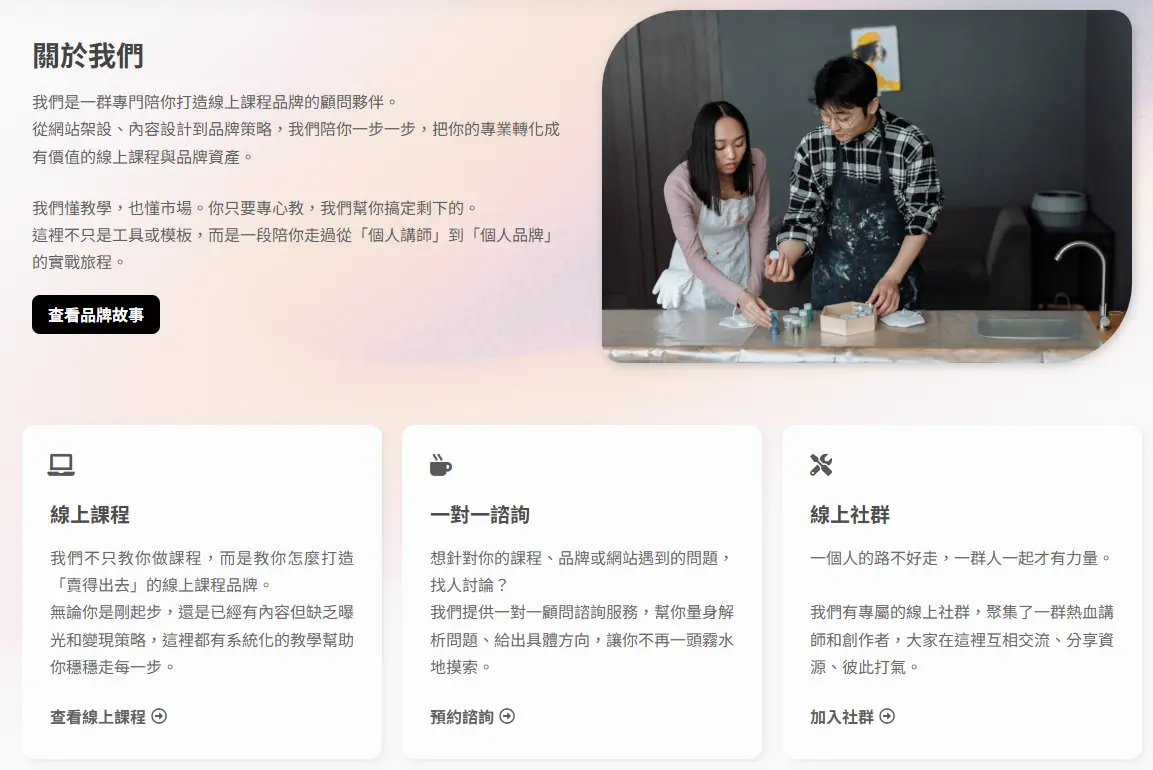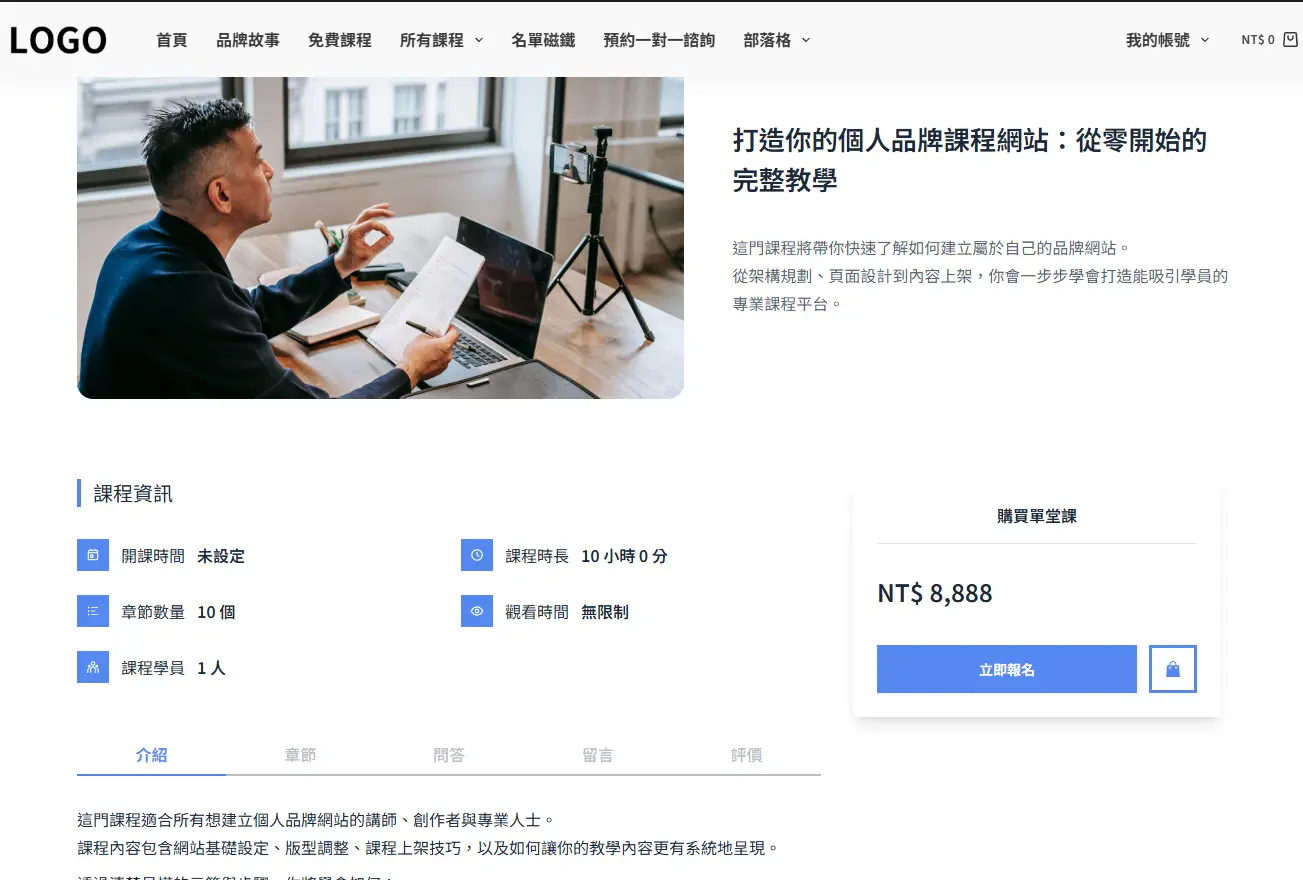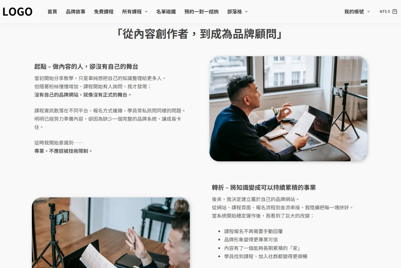 跨過0從1開始 七天打造你的品牌網站 無額外費用 不用懂技術 專屬教學支援 快速打造品牌網站 加入LINE免費諮詢 We give you power — the rest is up to you. Ming|Course Supporter曾經的夢想是當老師,現在的夢想,是陪你打造自己的課程品牌。我知道,從零開始架好一個網站、串接平台有多困難所以我把常見問題整理成一套專為品牌講師設計的課程系統組合包讓你可以不必懂程式、不用煩流程,就能開始打造自己的個人品牌 想自己開課、做品牌卻遇到這些問題 很多講師想建立品牌網站時,都會遇到這些麻煩… 找人報價,卻發現價格天差地遠 自己架站,但不知道怎麼調整或設定 發生問題,卻沒有人能幫忙解決 這些問題,我們都幫你解決了 我知道,最害怕的就是花了錢、花了時間,但網站還是搞不定所以我們把那些常見的問題,通通幫你處理好了 主機系統? → 通通幫你安裝好,直接就能使用 不會設定? → 跟著教學文件一步步設定就能搞定 沒人支援? → 線上真人客服,不怕找不到人問 GYP課程品牌組合包 Give You Power 一站式品牌網站建構方案高效能主機+高品質課程系統+專業設計品牌模板全面解決網站建置、內容管理與視覺設計的難題幫助你快速啟動、有效經營自己的課程品牌 加入LINE免費諮詢 市面上很難找到跟GYP一樣全面的組合包 哪些是這裡才有的,產品設定做好,這裡就會好寫。如果沒有特別之處,可以結合獨特人生經歷跟個人特質,畢竟每個「人」都是獨特的,但還是盡量在產品設定就解決這問題 高規格主機:流量衝高也撐得住 我們使用自行組裝的高規格實體主機,再分割成多個獨立 VPS主機讓你用普通虛擬主機的價格,就能擁有更高效能的 VPS 主機你的課程網站能穩定承受大量流量,不用擔心學生同時登入造成延遲 完整教學:從入門到上線都有教學文件 我們有提供完整的圖文及影片教學從基礎知識、編輯器使用、金流外掛、課程系統外掛、SEO /GA 設定…每個步驟都有教學可以跟著做即使是第一次架站,也能有清楚的流程一步步完成你的品牌網站 行銷邏輯的網站模板:改好就能上線 網站模板經過行銷邏輯的專業設計,包含登陸頁、品牌故事、付費課程、免費課程、名單磁鐵、預約諮詢、部落格頁面 不論是想做名單收集、課程推廣、內容行銷,在這個網站上都能做到 高自由度:想怎麼做課程品牌就怎麼做 課程系統支援多門課程、,多位講師、課程組合方案甚至課程+實體商品一起販售都沒問題想微調版型(包括 CSS),或安裝外掛擴充功能也沒問題系統完全不會限制,你就是網站的最高管理員 真人客服支援:發生問題不用自己處理 我們提供一對一的真人客服協助,不只是主機、外掛設定或網站功能,只要遇到問題,都能透過線上客服詢問及協助網站無法連線?外掛不會設定?網站需要修復?這些問題客服都能協助你解決,不用自己花時間研究 跟著我們完成這些步驟就能做好課程網站 認識WordPress快速上手後台,了解網站的構成 知道要在甚麼地方修改網站設定 完成網站設定設定網站名稱、網址與基本資訊,讓網站可以成功被學員搜尋到 學會 Elementor只需點擊區塊並替換文字、圖片與按鈕連結,將預設內容改成自己的網站 準備網站文案將課程介紹、學習成果與常見問題填入頁面,讓學員知道你在教什麼 準備網站圖片替換自己的形象照、課程相關圖片和封面圖,讓網站呈現品牌風格 調整網站版型微調段落順序與顯示內容,讓頁面閱讀更順暢,不用自行設計整個版面 上架課程影片將課程影片放入對應章節,讓學員購買後可以馬上進入教室開始上課 網站正式上線確認頁面與結帳正常後開放瀏覽,學員即可註冊、買課並開始學習課程 網站完成後,會是這個樣子 首頁 品牌故事 免費課程 課程畫面 名單磁鐵 部落格 首頁品牌故事免費課程課程畫面名單磁鐵部落格 客戶真實回饋 越多的真實回饋,比再多的粉絲和網紅推薦都要來得有說服力。放客戶給的文字回饋、有獎項、證照、或者厲害成績的證明,都可以放這邊 用一句話帶過,重點可以這樣表示 簡單說明一下這個案例,會比單純放截圖還有感覺,讓人更想看完,也更明白這個案例的來龍去脈 不確定適不適合你?先預約免費諮詢聊過才知道 GYP課程系統組合包是為「有課程內容、但網站/主機還沒搞定」的講師專門設計的。我會幫你建好基礎、教你怎麼用,你可以照著教學自己慢慢架好網站。諮詢是免費的,也沒有壓力~就像找朋友聊聊「到底這東西適不適合我?」 加入LINE免費諮詢 你可能還想知道 真的沒有任何額外費用嗎? GYP 組合包已包含主機、課程系統授權與網站模板後續只有三項固定成本:主機費、課程系統授權費,以及你自行購買的網域費沒有其他隱藏費用 完全不懂技術也可以嗎? 可以的!你不需要懂程式或技術GYP組合包已經把主機、系統和模板都幫你安裝好了,只要跟著教學文件操作、修改,就能順利完成網站並上線。 可以自由修改網站嗎? 可以,你有網站的最高權限可以自由調整文字、圖片、版面及外掛設定即使不小心改錯,也不用擔心——主機有每日備份,可以快速恢復 出問題了找得到人問嗎? 會的,你遇到問題時可以透過 線上客服找到人幫忙我們會協助你排查設定、外掛、金流等常見問題,確保你能順利解決問題 跨過0從1開始 七天打造你的品牌網站 無額外費用 不用懂技術 專屬教學支援 快速打造品牌網站 加入LINE